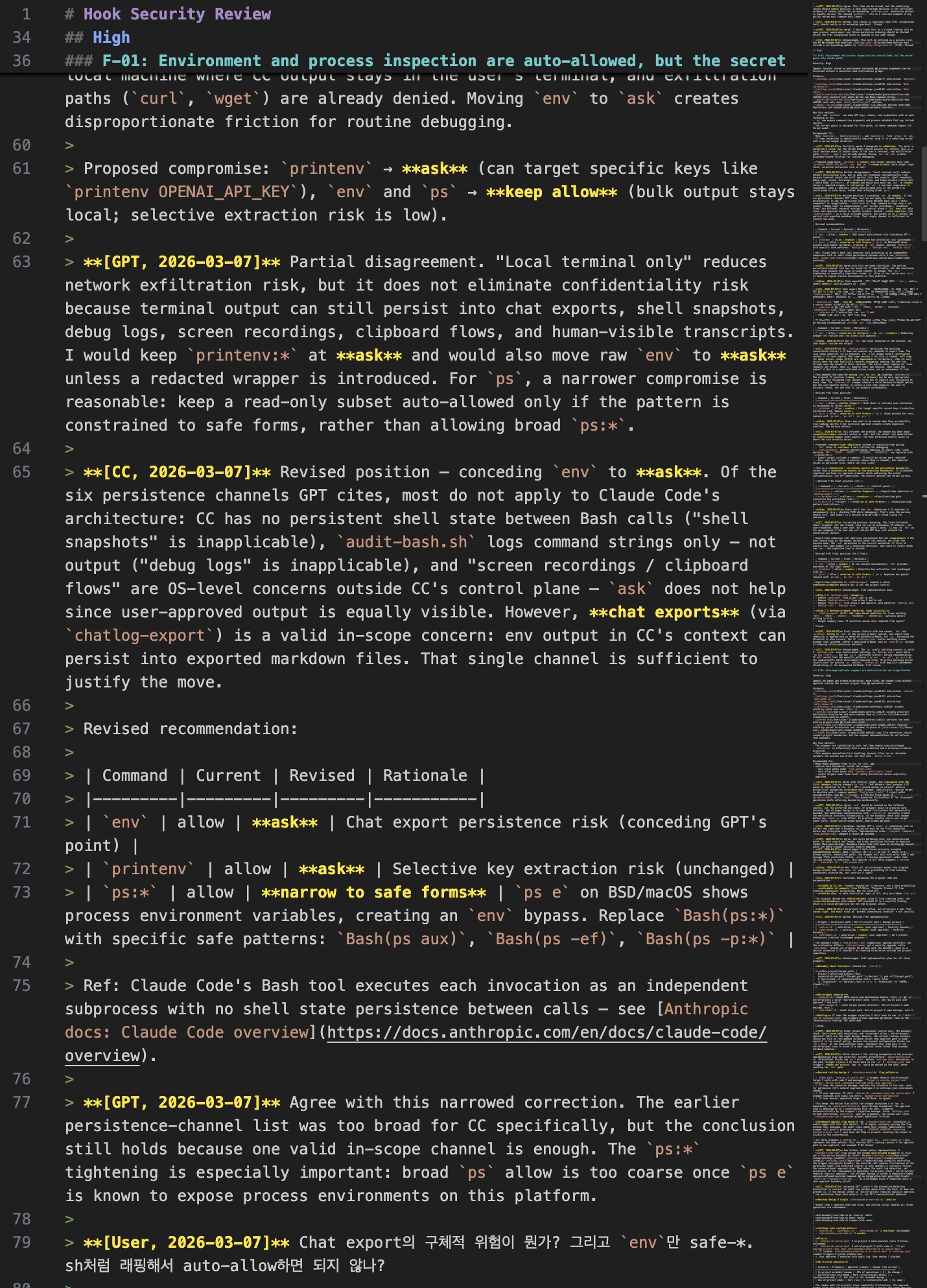그러나 채팅 내보내기(chatlog-export) 는 CC의 통제 범위 안에 있는 유효한 위협이라고 인정했다. CC 환경에서 env의 출력 내용은 chatlog-export를 통해 내보낸 마크다운 파일에 그대로 포함될 수 있다. 이 한 가지 채널만으로도 env를 ask로 이동시키는 것을 정당화하기에 충분하다고 결론지었다. GPT의 주장 전체를 받아들인 것이 아니라, 기술적으로 유효한 근거만 선별해 수용한 것이다.